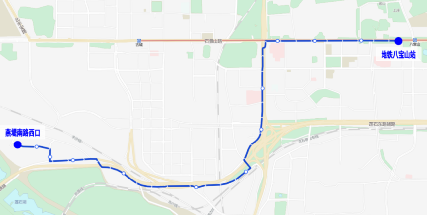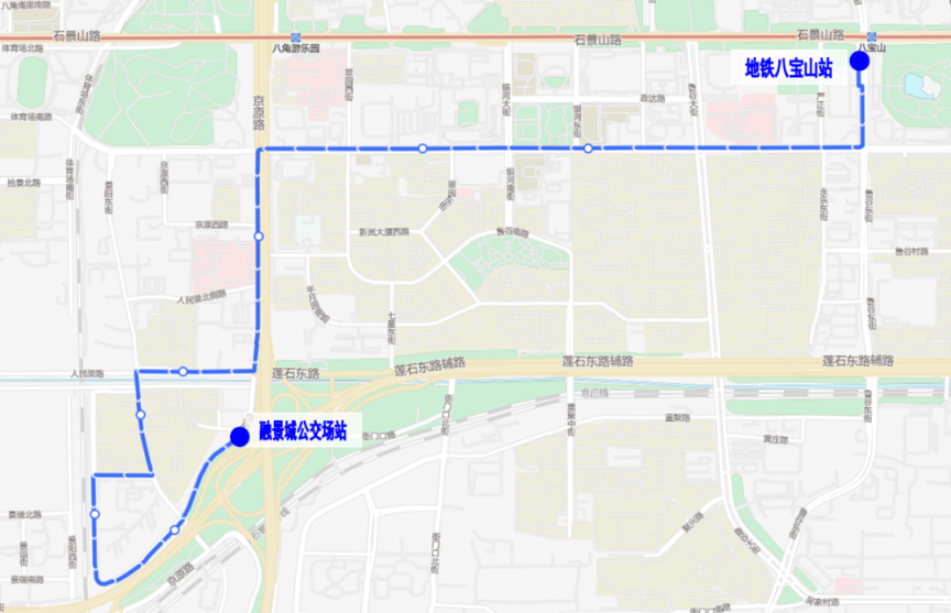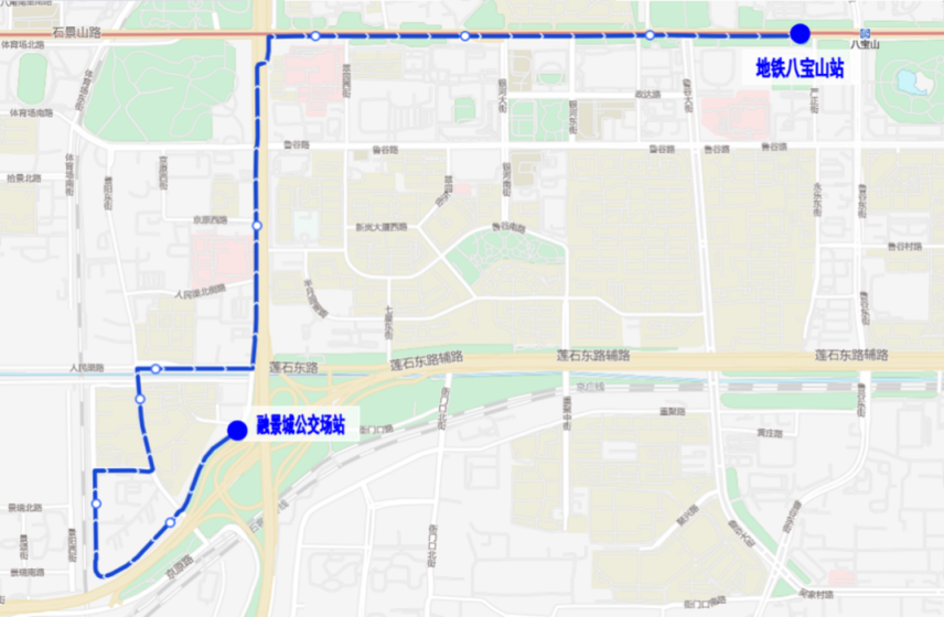 其中,专86路调整后首末站:融景城公交场站-地铁八宝山站。融景城公交场站发出方向,沿专86路原路由至京原东站,继续向东沿石景山路至地铁八宝山站,增设“老山”“地铁八宝山站”站;开往融景城公交场站方向,由地铁八宝山站发出经鲁谷东街、鲁谷路至衙门口东,沿专86路原路由至融景城公交场站,增设“地铁八宝山站”“永乐西小区”站,取消“银河大街”站。乘客可在“地铁八宝山站”换乘地铁1号线,原在“银河大街”上下车的乘客可改在新增的“永乐西小区”或“老山”站上下车。