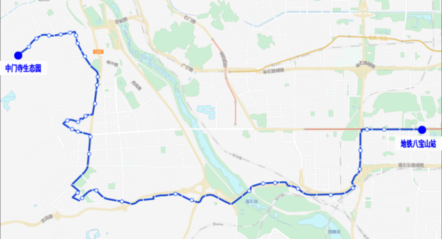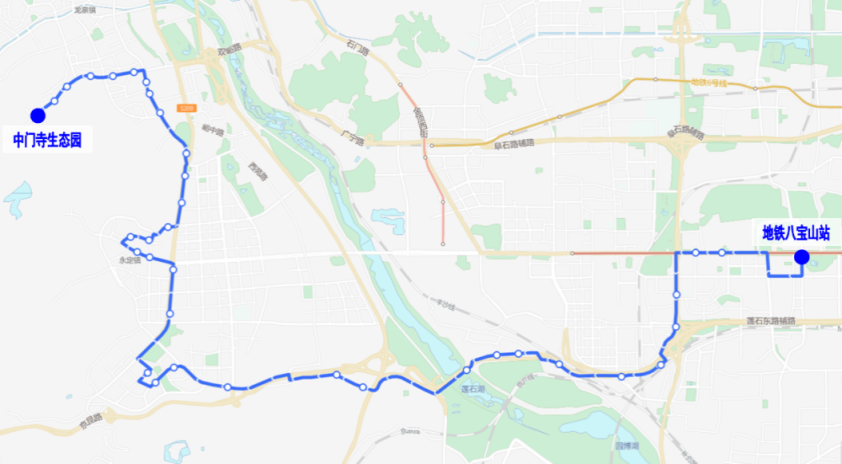 965路调整后首末站:中门寺生态园-地铁八宝山站。中门寺生态园发出方向,沿965路原路由至京原东站,继续向东沿石景山路至地铁八宝山站,增设“地铁八宝山站”;开往中门寺生态园方向,由地铁八宝山站发出经鲁谷东街、鲁谷路、鲁谷大街、石景山路至京原东站,沿965路原路由至中门寺生态园,增设“地铁八宝山站”乘客可在“地铁八宝山站”换乘地铁1号线。