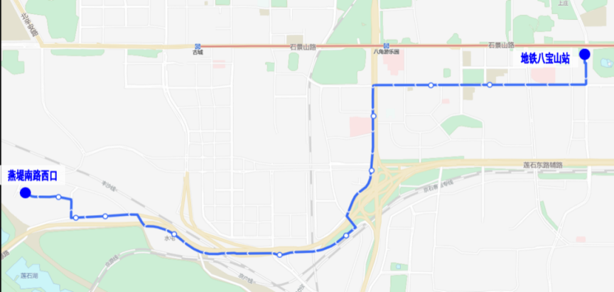专91路调整后首末站:燕堤南路西口-地铁八宝山站。燕堤南路西口发出方向,沿专91路原路由至京原东站,继续向东沿石景山路至地铁八宝山站,增设“老山”“地铁八宝山站”站;开往燕堤南路西口方向,由地铁八宝山站发出经鲁谷东街、鲁谷路至衙门口东,沿专91路原路由至燕堤南路西口,增设“地铁八宝山站”“永乐西小区”站,取消“银河大街”站。乘客可在“地铁八宝山站”换乘地铁1号线,原在“银河大街”上下车的乘客可改在新增的“永乐西小区”或“老山”站上下车。